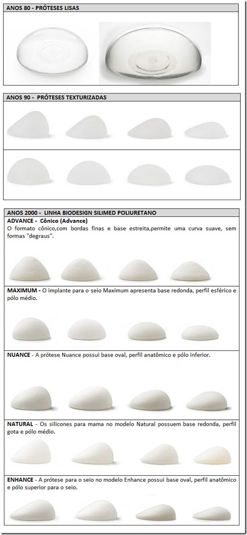 A disponibilidade de uma enorme gama de opções, considerando o formato (anatômicas, redondas, cônicas), o revestimento (texturizadas, lisas ou de poliuretano) e características como projeção, largura e altura resulta de 50 anos de evolução que nos trouxeram a próteses mais seguras, duráveis e adaptáveis ao corpo da mulher e aos diferentes tipos de mama.